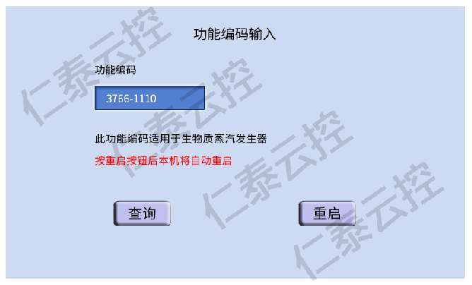 本機(jī)出廠后首次加電,軟件功能編碼未設(shè)置時(shí),需要您根據(jù)熱能設(shè)備的類(lèi)型、傳感器、受控設(shè)備和控制邏輯的組態(tài)輸入軟件功能編碼(功能編碼應(yīng)由熱能設(shè)備制造企業(yè)的專業(yè)人員設(shè)置,如功能編碼和您的熱能設(shè)備不匹配,本機(jī)將無(wú)法正常工作,甚至可能影響熱能設(shè)備運(yùn)行的安全,造成安全事故?。?。輸入軟件功能編碼后,如您輸入的功能編碼不在本機(jī)支持的功能編碼列表中,畫(huà)面顯示“本機(jī)不支持此功能編碼。”如您輸入的功能編碼在本機(jī)支持的功能編碼列表中,畫(huà)面顯示功能編碼適配的設(shè)備類(lèi)型,如“此功能編碼適用于生物質(zhì)蒸汽發(fā)生器”。核對(duì)無(wú)誤后,請(qǐng)按重啟鍵,本機(jī)將保存您輸入的功能編碼并自動(dòng)重啟。您也可按“查詢”鍵,查閱本機(jī)所有支持的功能編碼列表。