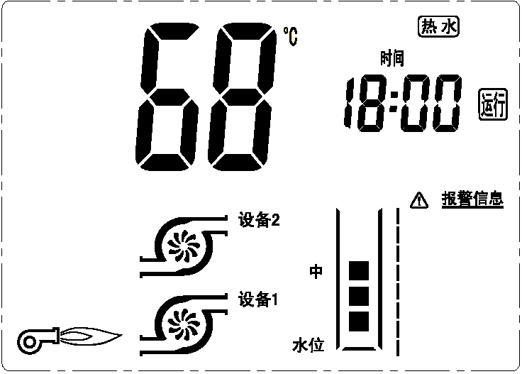 在屏幕右上方顯示控制器目前所處的狀態(tài)。當控制器處于待命狀態(tài)時該位置顯示“ ”;當控制器處于運行狀態(tài)(燃燒器開始根據(jù)爐水溫度狀態(tài)工作)時該位置顯示“ ”;當控制器處于報警狀態(tài)(聯(lián)鎖停爐保護)時該位置顯示“ ”;當控制器處于參數(shù)設(shè)定狀態(tài)時該位置顯示“ ”。