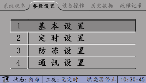 ”鍵,主菜單選中“參數(shù)設(shè)置”界面后,界面上顯示“基本設(shè)置”、“定時(shí)設(shè)置”、“防凍設(shè)置”、“通訊設(shè)置”、“模入設(shè)置”、“系統(tǒng)配置”六類需要設(shè)置的參數(shù),光標(biāo)默認(rèn)選中第一個(gè)選項(xiàng)“基本設(shè)置”。如下圖: