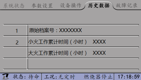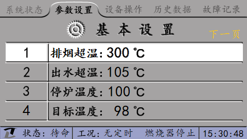 注:上圖只是示范性界面,圖中顯示的參數(shù)名稱只代表最基本的常壓熱水爐的參數(shù),更詳細(xì)的參數(shù)依據(jù)不同的要求有所不同。