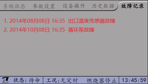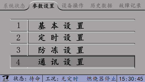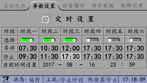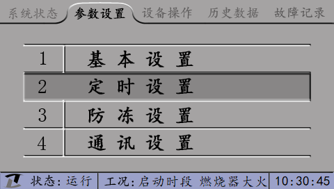 在屏幕正下方顯示控制器的工況。工況包括定時(shí)信息和燃燒器狀態(tài)。非報(bào)警狀態(tài)下,無(wú)定時(shí)顯示“無(wú)定時(shí)”,有定時(shí)顯示“啟動(dòng)時(shí)段”或“停止時(shí)段”;報(bào)警狀態(tài)下顯示具體的報(bào)警信息。