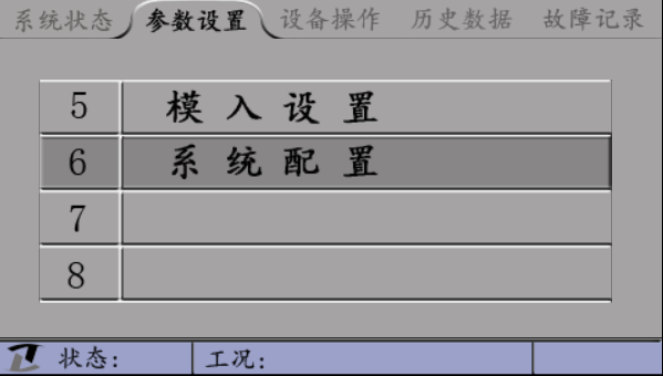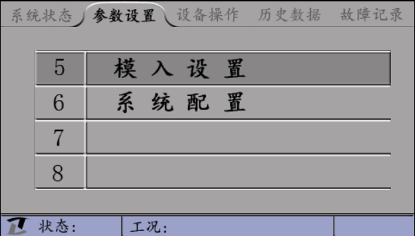 ”鍵,可以在“系統(tǒng)狀態(tài)”、“參數(shù)設(shè)置”、“設(shè)備操作”、“歷史數(shù)據(jù)”、“故障記錄”五個(gè)主菜單之間進(jìn)行切換。