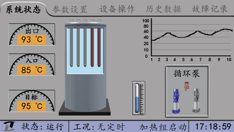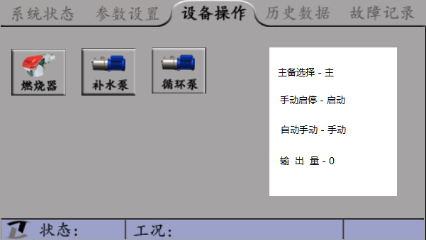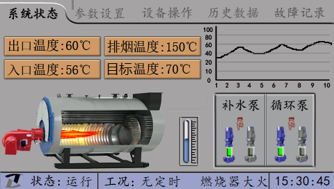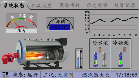 屏幕上同時(shí)顯示燃燒器(加熱組)、補(bǔ)水泵(給水泵)、循環(huán)泵(冷凝泵)的工作狀態(tài),水泵的主備狀態(tài)和手自動(dòng)狀態(tài)。在鍋爐的上方顯示當(dāng)前鍋爐的出口溫度、入口溫度或蒸汽的壓力狀況(壓力變送器顯示壓力值)以及排煙溫度等。在鍋爐的右側(cè)是鍋筒水位的模擬水位計(jì),顯示鍋筒水位的狀態(tài)。