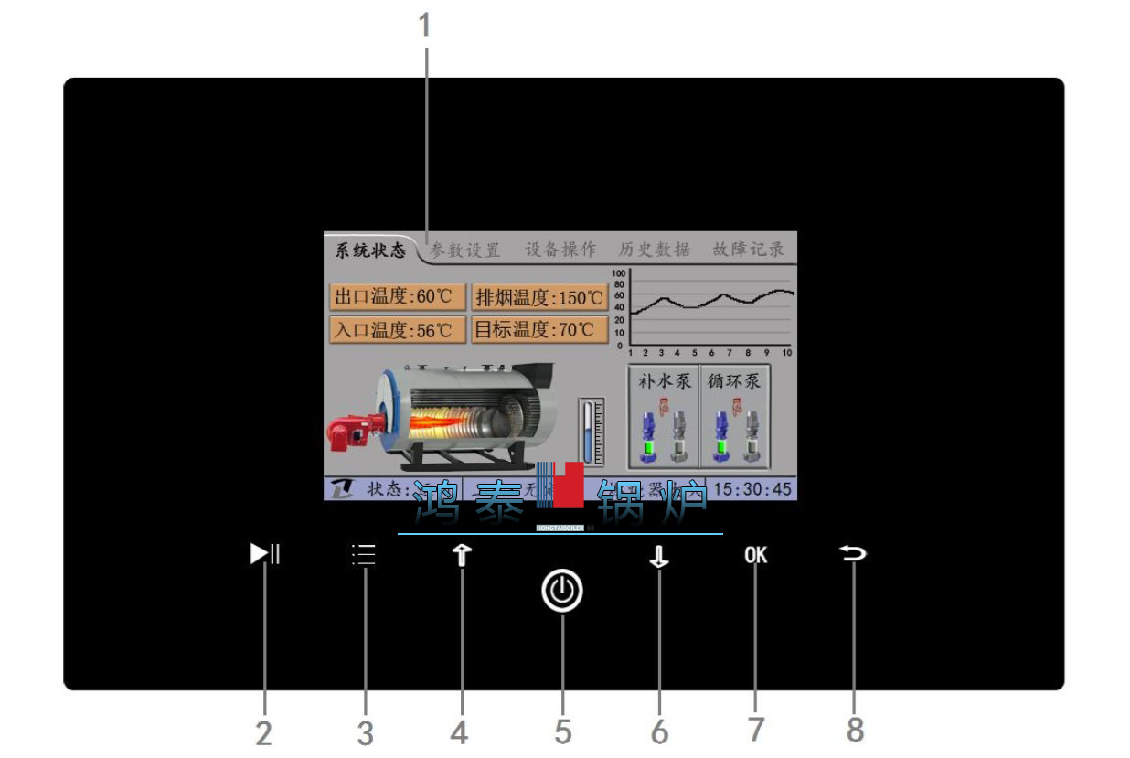下圖為控制器運(yùn)行狀態(tài)下,系統(tǒng)狀態(tài)的顯示,1為熱水爐,2是蒸汽爐,3為電加熱,具體爐型的系統(tǒng)狀態(tài)界面的顯示內(nèi)容會(huì)有差別,以實(shí)物為準(zhǔn)。
